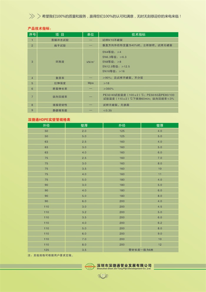 HDPE實壁管是以優質高密度聚乙烯樹脂( High Density Polyethylene,簡稱為"HDPE")為主要原料,經擠出方式加工成型的一種高新技術產品。具有耐腐蝕、抗老化、抗沖擊、機械強度高、使用壽命長、電氣絕緣性能優良等性能特點,可廣泛應用于埋地高壓電纜、路燈電纜保護套管等領域