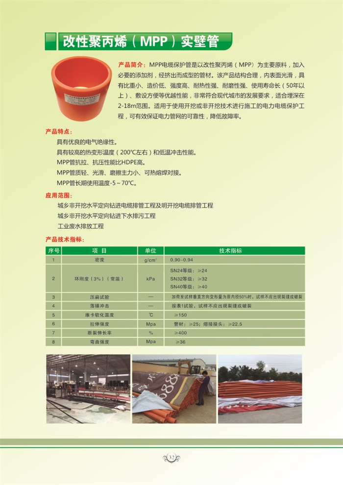 MPP電統(tǒng)保護(hù)管是以改性聚丙烯(MPP)為主要原料,加入必要的添加劑,經(jīng)擠出而成型的管材。該產(chǎn)品結(jié)構(gòu)合理,內(nèi)表面光滑,具有比重小、造價(jià)低、強(qiáng)度高、耐熱性強(qiáng)、耐磨性強(qiáng)、使用壽命長(50年以上)、敷設(shè)方便等優(yōu)越性能,非常符合現(xiàn)代城市的發(fā)展要求,適合埋深在2-18m范圍。適用于使用開挖或非開挖技術(shù)進(jìn)行施工的電力電纜保護(hù)工程,可有效保證電力管網(wǎng)的可靠性,降低故障率