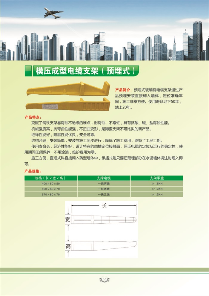 預(yù)埋式玻璃鋼電纜支架通過產(chǎn)品預(yù)埋安裝直接砌入墻體,定位準(zhǔn)確牢固,施工非常方便。使用壽命地下50年,地上20年
