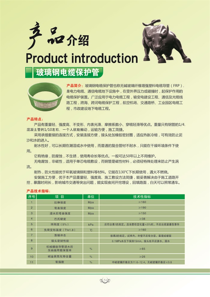 玻璃鋼電纜保護(hù)管也稱無堿纖維強強塑料電導(dǎo)管(FRP),是電力電纜、通信電纜地下設(shè)施中,在受外界壓力或碰撞時,起保護(hù)作用的電纜保護(hù)裝置。廣泛應(yīng)用于電力電纜工程,輸變電建設(shè)工程、通信及光纜線路工程,跨海、跨河電纜保護(hù)工程,航空機場、交通路橋、工業(yè)園區(qū)電纜工程,市政建設(shè)地下電纜工程。
