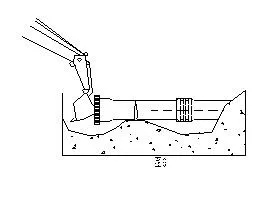 2.7對(duì)直徑小于1500mm的管道,可通過能跨地溝的挖掘機(jī)來插接。即在承口前面放置一塊或若干塊相當(dāng)?shù)哪举|(zhì)墊板保護(hù)管道端面,以防被挖掘機(jī)吊頭碰傷。然后旋轉(zhuǎn)吊頭使其緊貼墊板并推動(dòng)管道使承插口連接。(見圖9)